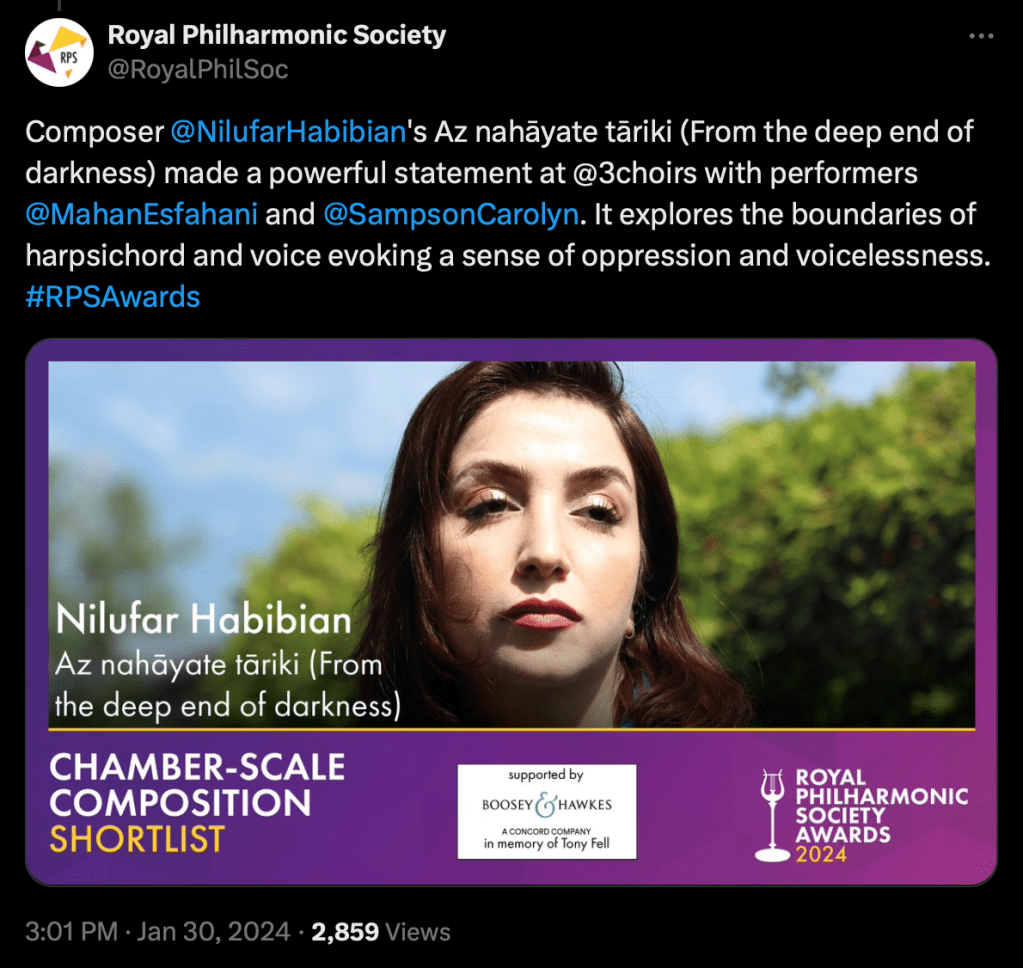 “Az nahāyate tāriki” – (From the Deep End of Darkness) for soprano voice and harpsichord has been shortlisted for the Royal Philharmonic Society Award for chamber-scale composition 2024. The piece was commissioned by Three Choirs Festival for Carolyn Sampson and Mahan Esfahani. It premiered on 22 July 2023 at Holy Trinity Church in Gloucester.